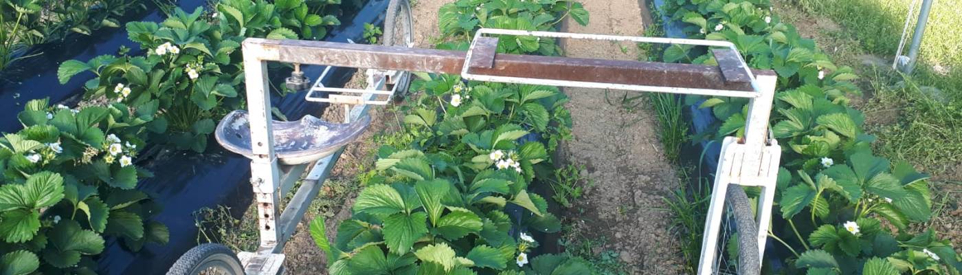 ” Per le fragole – ci spiega Stefano – è stato un inizio di annata un po’ particolare perché abbiamo patito abbastanza la siccità che c’è stata, visto che tra gennaio e marzo è piovuto solo due volte. Solitamente questo è un periodo in cui non c’è bisogno di irrigare e invece avremmo dovuto irrigare, ma non potevamo farlo perché non avevamo l’acqua dei consorzi irrigui che stavano facendo dei lavori, quindi è stata una partenza un po’ difficile poi insomma la situazione è migliorata. Di sicuro lavorando in biologico, in generale, ma in particolare la fragola se c’è un po’ uno squilibrio nell’ecosistema dell’ambiente, noi lo paghiamo un po’ di più, o perlomeno ce ne accorgiamo subito sulle colture. Così quest’anno abbiamo avuto problemi di afidi sulle fragole, che solitamente non abbiamo. A mio parere è stato legato al clima anomalo, perché mancava la fioritura generale, mancava erba e fiori eccetera e anche gli insetti utili facevano un po’ fatica, quindi abbiamo dovuto intervenire noi facendo dei lanci di insetti utili che andassero, in questo caso, a parassitizzare gli afidi. Abbiamo alcune armi anche nel bio però non c’è una certezza, sono tempi duri, se c’è qualcosa che non va ce ne accorgiamo un po’ di più. Detto questo le fragole adesso sono belle, abbiamo qualche varietà che ha patito un po’ di più, ma in linea di massima ci aspettiamo una buona produzione. Noi facciamo diverse varietà di fragole, le facciamo ormai da quando abbiamo iniziato, quindi questo è il nono anno, abbiamo sempre fatto fragola bio anche se i primi anni non eravamo certificati. Ovviamente le fragole sono coltivate in suolo, su terreno baulato, affinché non ci siano ristagni idrici e il frutto rimanga sul pulito, quindi sui teli. Terreno baulato vuol dire che c’è una pacciamatura, alta quasi 30 cm e la fragola rimane abbastanza in alto rispetto al suolo in modo che il frutto, quando poi è finita la fioritura, non va a toccare per terra dove rischierebbe di prendere marciume, lumache eccetera. Poi è anche una questione di comodità per la raccolta perché comunque è una raccolta abbastanza faticosa, anche se noi abbiamo una sorta di bici fatta apposta, che usiamo per viaggiare tra un filare e l’altro nella raccolta. Coltiviamo diverse varietà quasi tutte varietà unifere, ovvero che fanno una produzione sola, a maggio più o meno, una produzione all’anno, la classica fragola. Abbiamo diverse varietà più che altro per cercare di avere un periodo di raccolta un po’ più lungo, per non averle tutte insieme, anche se da quel punto di vista quest’anno abbiamo visto che il clima che è stato prima caldo poi freddo le ha rallentato, insomma si stanno un po’ avvicinando le maturazioni di diverse varietà e probabilmente avremo una stagione un po’ più corta di quello che speravamo, con più prodotto comunque.