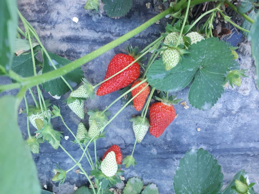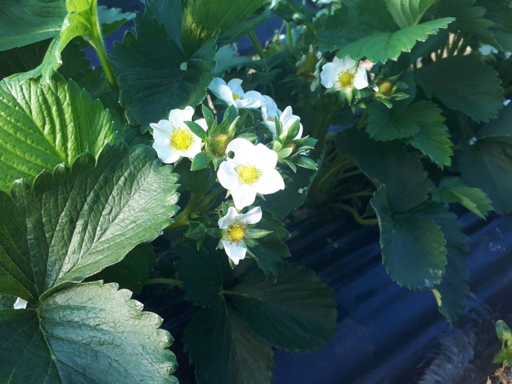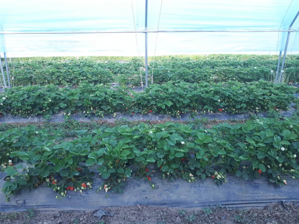 L’80% sono piante al primo anno di produzione che abbiamo trapiantato l’estate scorsa intorno a Ferragosto, c’è solo due tunnel che sono una varietà differente, si chiama Murano quella è al secondo anno. Abbiamo sempre fatto cicli di due anni adesso stiamo cercando di accorciarli a un anno perché comunque abbiamo problemi un po’ nella gestione soprattutto nell’utilizzo dei teli in un ambiente come il nostro che è bello vivo, vivo di tutto… quindi per dire anche i topi che sotto i teli vanno a nozze quindi abbiamo visto che con cicli di due anni facciamo fatica poi a gestire le piante quindi tendiamo a fare trapianti tutti gli anni anche se questo è un po’ complesso per noi perché ovviamente la fragola in generale, ma ancora di più se fatta in bio, richiede delle rotazioni ampie, quindi vuol dire che noi dobbiamo avere molta terra a disposizione. Per mantenere più o meno stabile il numero di piante di anno in anno abbiamo bisogno almeno del triplo, se non quadruplo, della quantità di terra che abbiamo impegnato. Metto le fragole nello stesso posto ogni 3-4 anni perché la fragola prende tanto nutrimento e per problemi anche di sanità del terreno – la fragola è molto delicata – e poi comunque nel bio siamo comunque obbligati a fare delle rotazioni di un certo tipo, quindi devono essere almeno tre cicli differenti prima che possa ritornare la stessa coltura tra cui una leguminosa oppure facciamo una miscela di sovesci, dipende un po’ dalle annate.