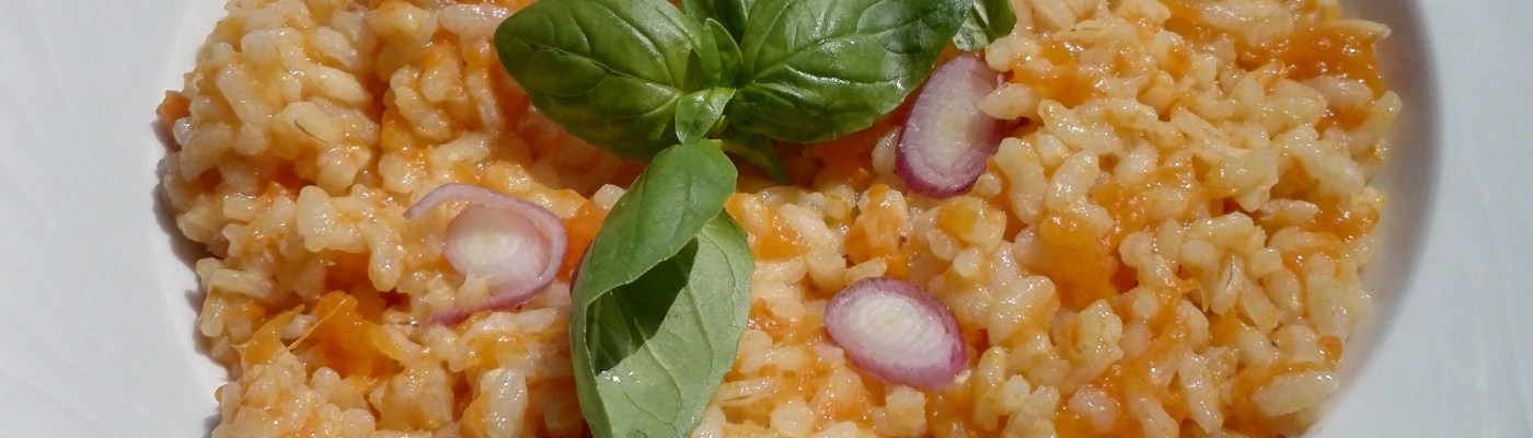 In una padella antiaderente metti un filo di olio, uno spicchio d’aglio, un rametto di rosmarino e fai saltare per qualche minuto la zucca. Quando sarà un po’ dorata, aggiungi mezzo mestolo di brodo vegetale, un pizzico di sale e copri con un coperchio per cinque minuti. Quando sentirai che i cubetti sono ben morbidi, schiacciali con la forchetta, in modo da farne una purea, anche non troppo fine. Versa questa purea nel riso e mescola bene.