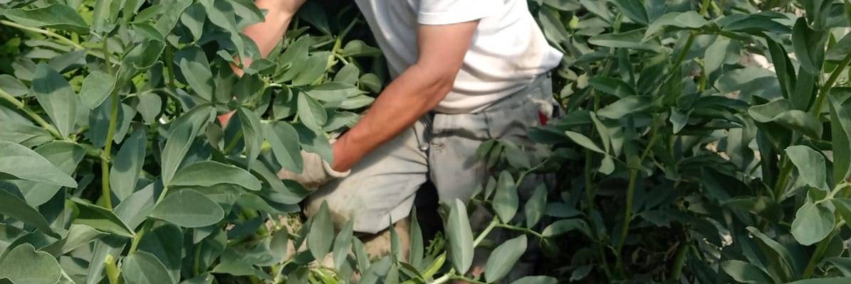 Le fave lo metto sotto serra perché sono più belle, le semino da novembre a febbraio, più o meno ogni due mesi. Adesso sto raccogliendo quelle che ho seminato a dicembre. Sotto sera sono più belle perché sono al caldo e protette dall’umidità. Le semino direttamente in terra. Le file sono anche 1 metro una dall’altra perché le piante vengono alte più di 1 metro. Da ogni pianta, se sono belle, raccolgo anche cinque-sei fave in due volte. Una pianta può anche arrivare a fare otto fave. Un po’ di erba viene sempre quando si bagna a pioggia tra le due file, però pazienza. Le bagno prima di raccogliere, adesso è una settimana che non le bagno più. Per comodità le ho bagnate a pioggia per non tirare la manichetta. Se no di solito metto la manichetta Quest’anno è andata bene, non ha fatto tanto freddo. Di solito raccolgo quattro ceste all’ora, circa 50-60 kg. Il raccolto che sto facendo ora dura circa due settimane. Le prossime le avrò tra circa un mesetto, inizio giugno, poi dipende dal clima, adesso fa di nuovo freddo. Come varietà adesso c’è la fava marocchina. Mia mamma le incesta, sono già pulite.