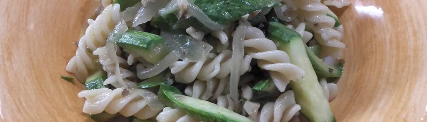 Metti in ammollo 10 funghi shiitake. Taglia 1 cipolla grande a mezzaluna e falla stufare con un filo d’olio extravergine di oliva e sale in una pentola larga e a fondo spesso. Nel frattempo taglia le zucchine a striscioline un po’ spesse. Quando la cipolla è ben stufata aggiungi le zucchine, sala e alza la fiamma per saltarle velocemente, affinché rimangano croccanti. Quindi trita a coltello i funghi shiitake e aggiungili alle zucchine gli ultimi 10 minuti. Spegni il fuoco. Quando la pasta è quasi pronta, riaccendi il fuoco sotto le zucchine, scola la pasta e falla saltare nel tegame con le zucchine 1-2 minuti in modo che l’amido rilasciato dalla pasta formi una cremina. Servi caldo.
