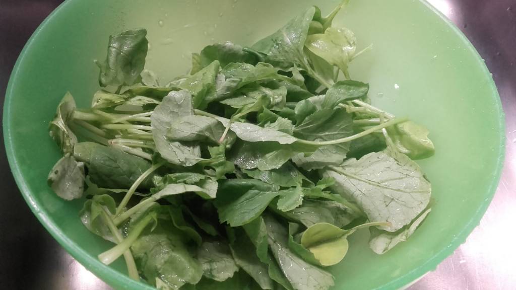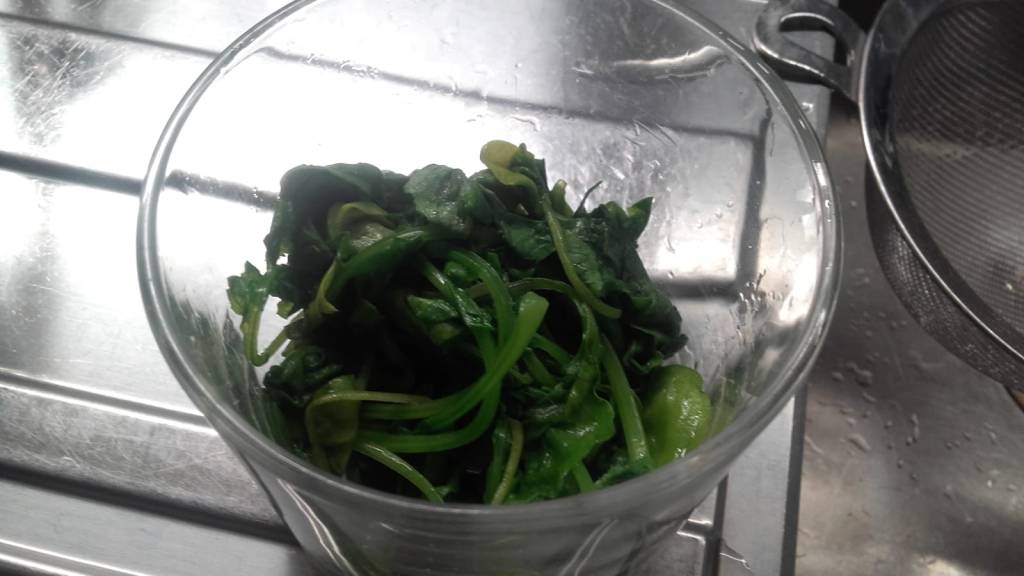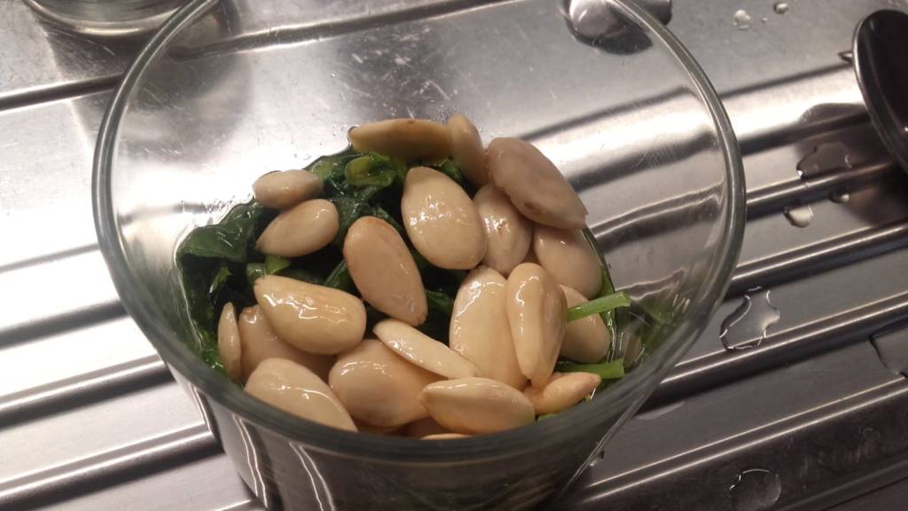 Pulisci bene i rapanelli, privali dei tuberi e lava accuratamente le foglie.Falle appena scottare in una pentola con acqua bollente.Scolale e strizzale bene.Trasferiscile nel bicchiere del frullatoreSbuccia delle mandorlee uniscile alle foglie di rapanello con sale, olio extravergine di oliva, 1/2 spicchio d’aglio.Frulla il tutto aggiungendo eventualmente qualche cucchiaio dell’acqua di cottura della pasta.Condisci la pasta con il pesto ottenuto.
