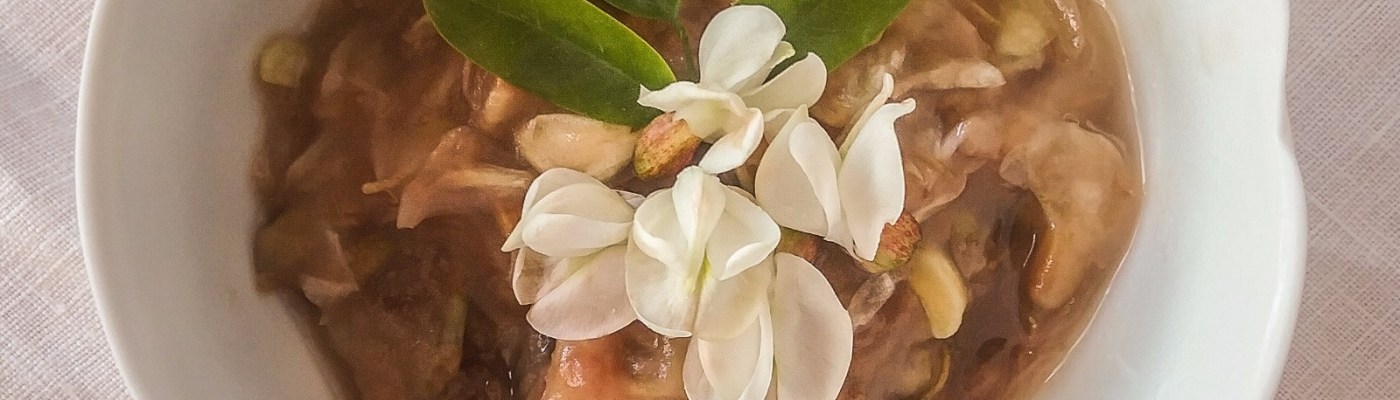 Lava e priva del torsolo 10 mele non trattate e taglia ogni mela in 4 parti. Man mano che le tagli, mettile in una pentola larga a fondo spesso e bagnale con il succo di 2 limoni e un pizzico di sale. Quindi fai cuocere inizialmente girando di continuo fino a che le mele abbiamo iniziato a buttar fuori il loro liquido. Quindi abbassa la fiamma e fai cuocere con coperchio a fiamma bassa. Quando le mele saranno ben cotte, frullale e rimettile sul fuoco. A questo punto sciogli 5 cucchiaini di kuzu in un po’ di succo di mela e aggiungilo alle mele. Fai cuocere ancora finché non si crea una sorta di gelatina e la crema di mele si compatta. Ora unisci 1 kg di petali di fiori di acacia lavati e asciugati. Fai cuocere per altri 3 minuti. Versa quindi la marmellata nei vasetti di vetro sterilizzati. Chiudi e sterilizza facendo bollire i vasetti per 20 minuti.