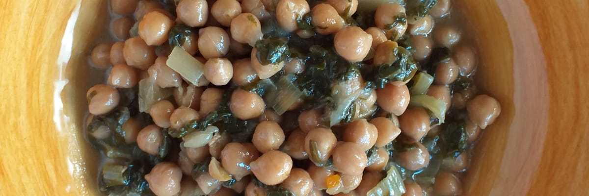 Metti a bagno 400 gr di ceci secchi in una bacinella con abbondante acqua per almeno 12 ore, avendo cura di cambiare l’acqua di ammollo almeno un paio di volte (24 h ancora meglio per eliminare l’acido fitico). Pulisci bene 200 gr di bietoline. Schiaccia 2 spicchi d’aglio senza togliere la pelle che lo ricopre e affetta finemente 1 piccola cipolla dorata e 1 rossa. In pentola a pressione versa un filo d’olio extravergine di oliva, 1/2 bicchiere di acqua, le cipolle, l’aglio, 1 cucchiaio di semi di cumino e lascia stufare coperto a fuoco basso finché la cipolla non diventerà trasparente. Sciacqua e scola i ceci e aggiungili in pentola alzando la fiamma e falli tostare per un paio di minuti. Aggiungi 2 cm di alga kombu sciacquata e 3 foglie di alloro e versa del brodo vegetale fino a coprire i ceci di almeno 2 cm. Chiudi e fai cuocere per 40 minuti dal fischio. Trascorso questo tempo, libera il vapore, apri la pentola, aggiungi le costine e 1 cucchiaio di cumino, se necessario unisci un altro mestolo di brodo e riporta sul fuoco per altri 30 minuti sempre dal fischio. Apri la pentola a pressione, lascia asciugare a fuoco medio per circa 10 minuti e insaporisci con sale.