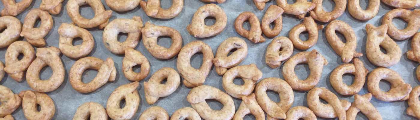 Intiepidisci 150 g di vino bianco (non troppo caldo), setaccia 500 g di farina (mix farina 0 e integrale, a piacere), aggiungi 125 g di olio di oliva, sale, il vino tiepido ed eventuali semi di finocchio. Inizia ad impastare il più possibile: dai 15 ai 20 minuti l’impasto deve risultare sodo. Mettilo a riposare, più riposa meglio è, se hai fretta (o non fai i taralli) oppure aspetti almeno 1/2 ora. Una volta data la forma di tuo gradimento vanno lessati in acqua salata, appena vengono a galla li metti su un canovaccio li fai asciugare dall’acqua in eccesso, li metti su carta da forno e li fai cuocere in forno caldo a 200 gradi (la temperatura naturalmente può variare da forno a forno, se il tuo scalda tanto a 180 va già bene): quando sono dorati li togli. Vanno vigilati altrimenti vengono abbronzati. Da fare con i bambini è divertente, è tutta manualità.