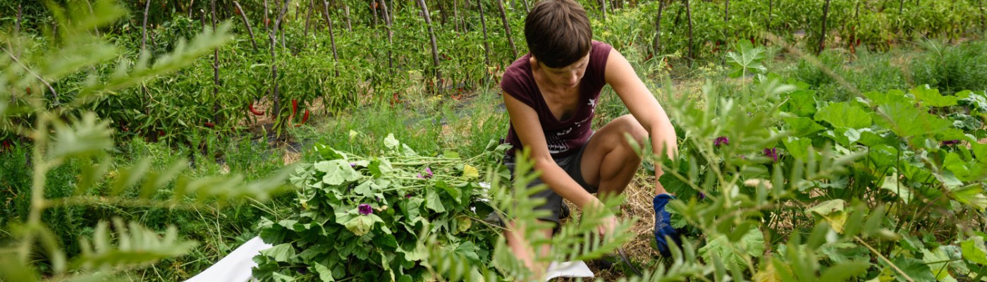 Le piante che coltivo sono tutte piante che utilizzo per fare le tisane o le erbe da cucina: timo, salvia, rosmarino si usano non solo in cucina, ma anche nelle tisane. Oggi, inteso come autunno 2020, sono 4 anni da quando ho aperto la P.IVA agricola, un po’ di più da quando ho iniziato a sperimentarmi in questo lavoro, posso dire che mi dà un reddito che ritengo valido, non tanto in proporzione alle ore di lavoro che faccio, se lo dividessi per le ore di lavoro probabilmente la retribuzione oraria sarebbe bassissima, però è un lavoro che mi permette di vivere qui, di gestirmi il tempo, di fare una cosa che mi piace, di poter anche insegnare ai miei bambini, non tanto il lavoro, quanto l’idea di coltivare le cose che servono, e che mi permette di stare con loro oltre il tempo di scuola quindi, date queste cose, il reddito che il lavoro mi dà, a oggi è soddisfacente, sperando che i prossimi due mesi vadano come un po’ me lo sono immaginato, perché per me sono fondamentali i mesi prima di Natale.”