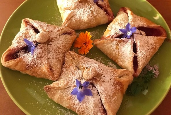Mentre è in frigo preparo le mele; io uso solo le mele renette perché hanno quell’acidulo che a me piace. Le preparo a pezzettini, non spessi, fettine che poi taglio a metà, perché devono stare in questi fagottini, le taglio, le condisco con il limone e una spruzzata di cannella, ma poca, se la vuoi mettere sennò puoi farne anche a meno, mescolo e lascio lì. Quando la pasta è pronta, la stendo con un mattarello abbastanza sottile, circa 2 mm di spessore, e poi faccio dei quadrati più o meno di 12-13 cm. All’interno puoi mettere le mele e basta, altrimenti puoi anche mettere un cucchiaino di marmellata così ha un po’ di fondo.