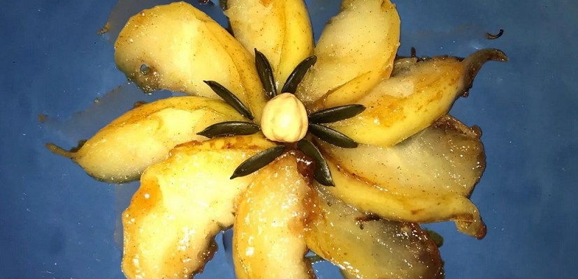 Taglio la mela a metà, tolgo il torsolo e faccio degli spicchi non troppo sottili. Sciolgo del burro in una pentola antiaderente e a fuoco piuttosto vivace, gli do una bella rosolata così si rosolano, non devono disfarsi. Nel burro metto anche un pochino di zucchero. Poi le compongo sul piatto, metto dei semi di zucca e in mezzo una nocciola.