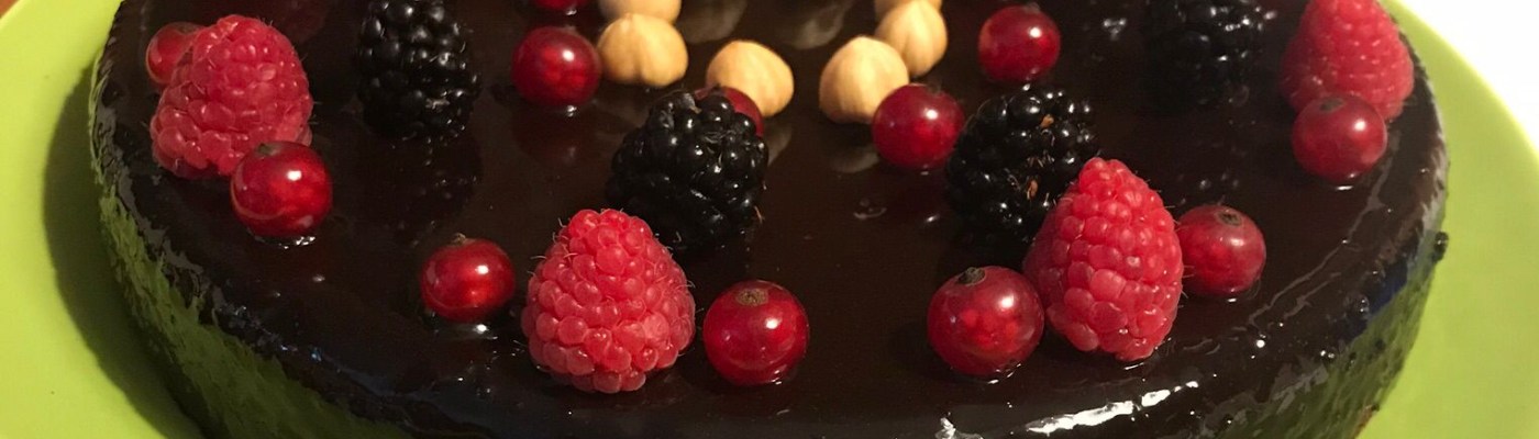 In un pentolino antiaderente metto 40 g di cacao cacao, prima passato al setaccio, 60 g di acqua, mescolo con la frusta e aggiungo 100 g zucchero. Metto sul fuoco e subito si scioglie. Porto a ebollizione finché le bolle diventano grandi e spengo. Lascio intiepidire, metto sulla torta con sotto una graticola per raccogliere il cioccolato in eccesso. Poi la decoro con nocciole, lamponi, mirtilli o con della granella tritata.