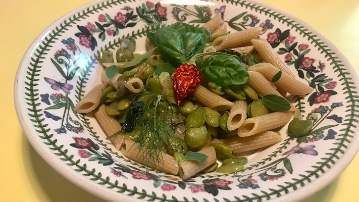 Quando è tutto pronto, scola la pasta, butta su le fave, metti delle foglioline di maggiorana che quelle, a crudo, sono sempre squisite, danno un sapore particolare, dell’aneto se vuoi, ma non è indispensabile, delle foglioline di basilico, un giro d’olio ed è pronto.