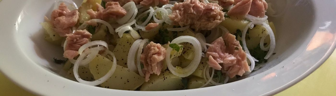Fai lessare le patate novelle, scolale e rimuovi la buccia mentre sono ancora tiepide. Tagliale a pezzettoni e disponile su un piatto da portata. Aggiungi dei cipollotti freschi tagliati a rondelle, santoreggia, prezzemolo e filetti di tonno a pezzetti. Condisci il tutto con un’emulsione di olio extravergine di oliva, poco aceto, sale e pepe.