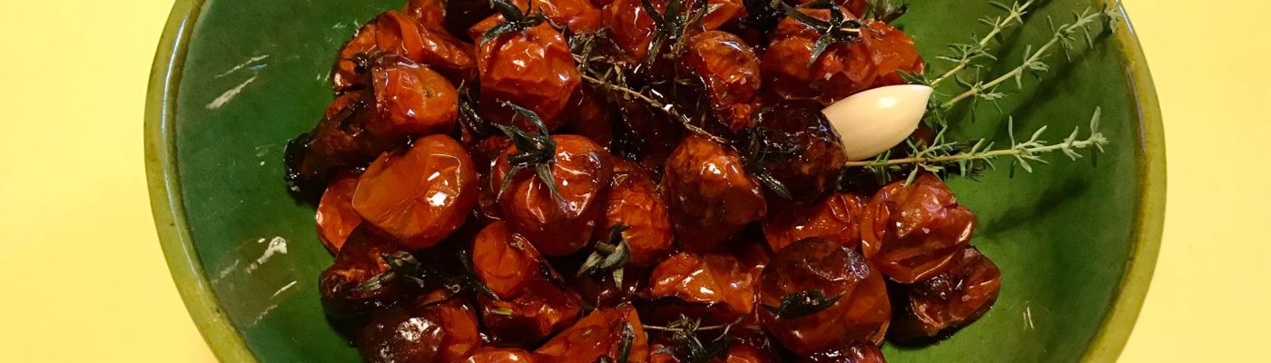 Lava i ciliegini, lascia il gambetto e mettili con la carta da forno in un’ampia teglia. Cospargili con due cucchiai di olio extravergine di oliva, sale, zucchero a velo, timo e aglio. Mescola e fai cuocere in forno per 2 ore a 120° .