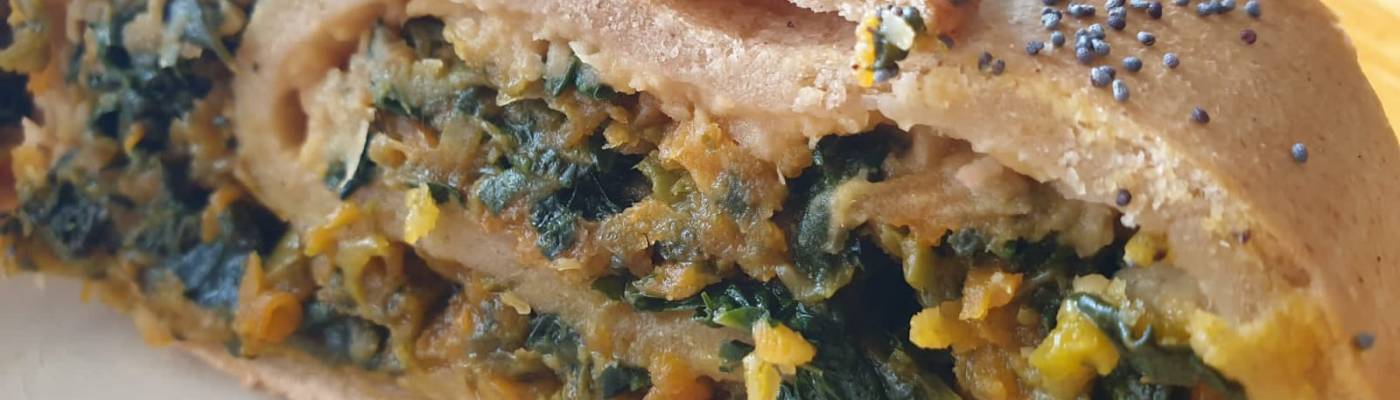 Spalma tutta la pasta con il composto di ceci e poi distribuisci le verdure, tranne il lato che servirà per chiudere (uno dei due bordi lunghi, lascia scoperti 2 cm).
