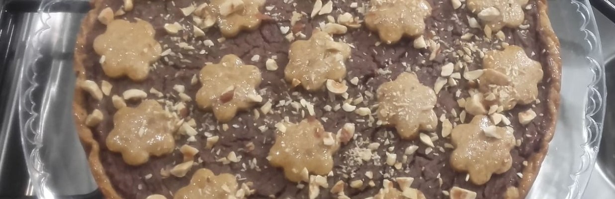 Prepari la frolla la lasci riposare per circa 30 min e la stendi nella teglia. Tienine da parte un po’ per le striscette. Bucherella la base con la forchetta e versaci la crema di castagne. Metti le strisce o forme a piacere e cuoci in forno a 180° per circa 25/30 min a seconda del forno. Deve essere bella dorata. Spolvera con un po’ di granella di nocciole tostate.