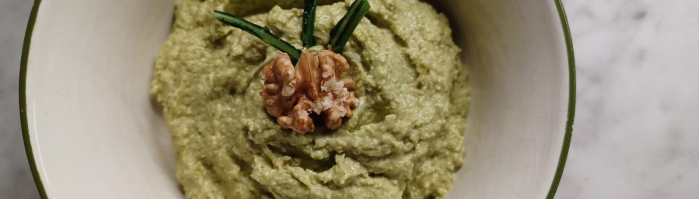 Con un coltello professionale, o in assenza con una mezzaluna, tritare finemente la verdura cotta. Versarla verdura nel recipiente di plastica in dotazione con il frullatore, aggiungere olio evo qb e salare un pochino, se si vuole mettere 1 pomodoro secco. Frullare finché si viene a creare una crema. Se necessario, aggiungere pochissima acqua calda. Aggiungere solo successivamente le noci o le mandorle e azionare il frullatore ad intermittenza in modo tale da mantenere una certa consistenza al palato dei semi oleosi. Assaggiare e regolare di sale. Se si desidera, aggiungere 1/2 cucchiaino di acidulato di umeboshi (in tal caso ricordarsi di mettere meno sale poiché l’acidulato è già di per sé molto salato).