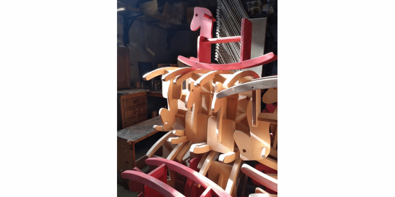 “Il nostro è proprio un gioco che, pezzo per pezzo, viene passato nelle nostre mani – ci racconta Elio di Giocolegno: sono assi e poi diventano un cavallino a dondolo. È proprio puro legno di faggio con qualche vite.