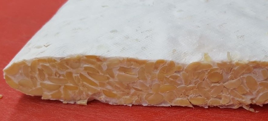 “Il mio tempeh di ceci – ci spiega Alberto Lavarini, Il Fermentista – è un fermentato che viene fatto utilizzando una muffa che viene inoculata sul legume e ricorda un po’ la muffa del brie: va a unire i chicchi dei ceci e li tiene insieme in un panetto bello consistente che profuma, ricorda un pochino il fungo.